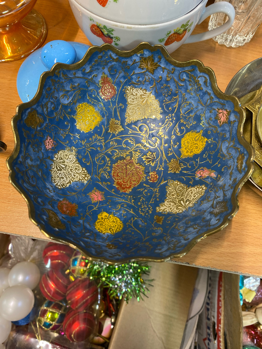 Встречала меня очень красивая и нарядная латунная ваза, расписанная эмалями. Это Индия времен СССР, даже этикеточка сохранилась. Нравится мне их яркий этнический колорит.