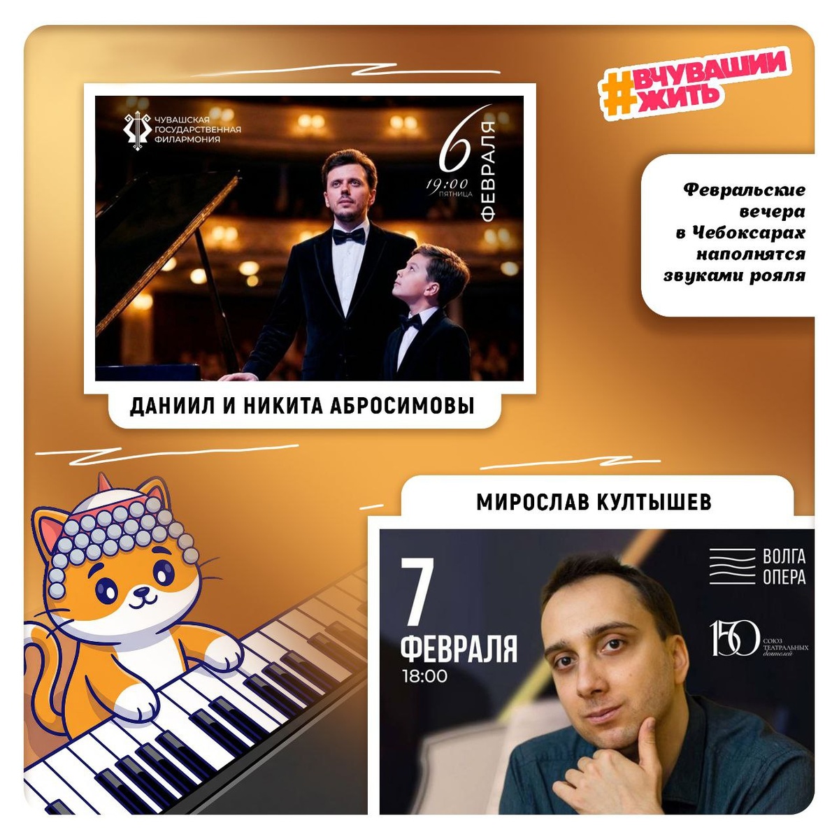 Илемпи задумчиво перебирает клавиши. Говорит, пианино – удивительный инструмент. Один, но в нём живёт и целый оркестр, и тихий шёпот. В феврале чебоксарские рояли расскажут две особенные истории. 6 февраля, Филармония. Свой диалог поведут Даниил и Никита Абросимовы. Отец и сын за одним роялем в программе «От Моцарта до Золотого Щелкунчика» – редкая возможность услышать, как музыка передаётся из рук в руки. 7 февраля, «Волга Опера». «Шедевры музыкального романтизма» представит один из лучших пианистов современности Мирослав Култышев. Мощный Рахманинов и пронзительный Шопен в исполнении одного из лучших пианистов современности – это вечер, который остаётся с вами. Промокод АНШЛАГ подарит вам скидку 25%. А если бы в вашем доме зазвучал рояль, какую бы историю вы попросили его сыграть? 📍 Чувашская филармония и Театр «Волга Опера». 📆 6 и 7 февраля, 19:00 и 18.00 Подписаться / Предложить новость