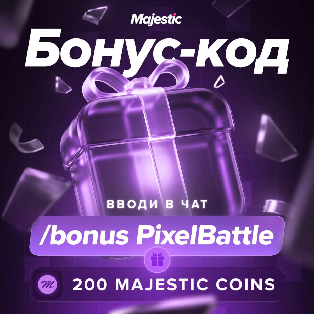 🎨 Забирай бонус на 200 Majestic Coins и продолжай творить шедевры — компенсируем неудобства и заряжаем вас для финального рывка. 👉Вводи в чат игры /bonus PixelBattle на 200 😍* *Код действителен для игроков, зарегистрированных до 29.01.2026 06:00, активен до конца дня 02.02.2026. *Активировать код можно только на одном из серверов проекта. ❤️ Majestic Role Play