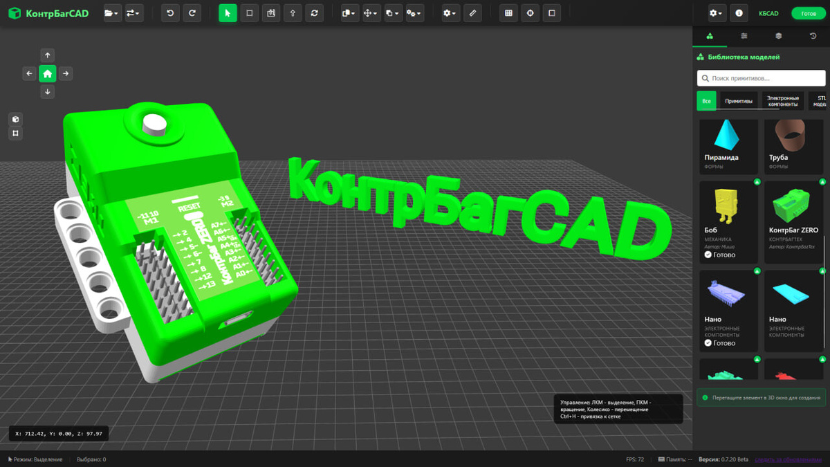 Встречает нас 3D режим. Интерфейс и управление приближены к Tinkercad. Сверху расположена панель инструментов. По умолчанию активирован инструмент выделения. В этом инструменте можно таскать объекты указателем мыши (как в Tinkercad), при каждом перемещении появляется линия перемещения и поле для ввода дистанции перемещения.