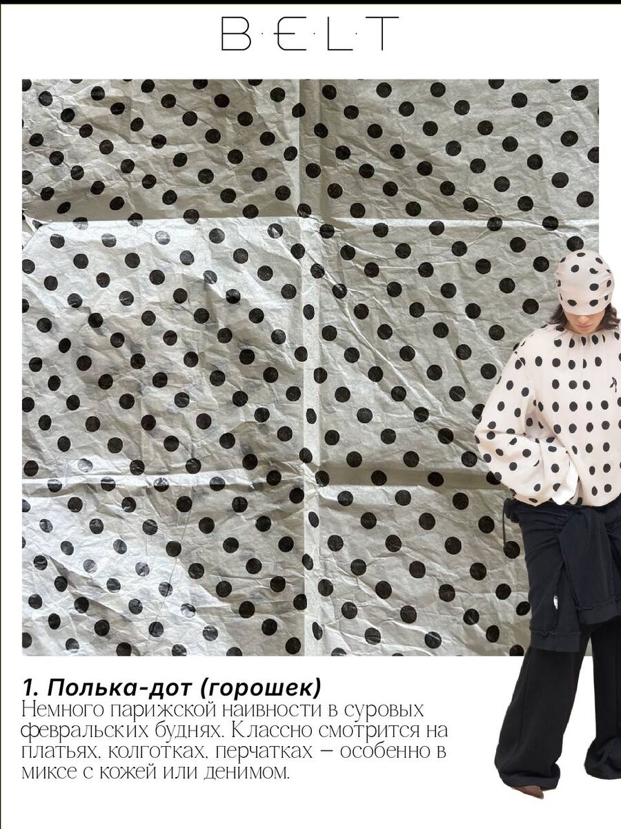 Fast-fashion бодро подкидывает микро тенденции. Мы полазили в BELT и собрали для вас февральский чек-лист хитов + мудовые рефы из Pinterest и свежие примеры из лукбуков брендов. Полистать — приятно. Купить всё подряд — вопросики к финансовой грамотности. Но что же сейчас активнее всего мелькает в лентах и витринах: - ретро-настроение в стиле Zivert пробивается к нам через горох и джинсы flare; - preppy через футболки-поло; - бельевой стиль становится основной основ; - бахрома дополняет и добавляет динамики в образ. Все примеры, сочетания и визуальные рефы мы уже разложили по карточкам. Листайте, вдохновляйтесь и решайте сами: берём тренд целиком или аккуратно адаптируем под свой реальный гардероб?