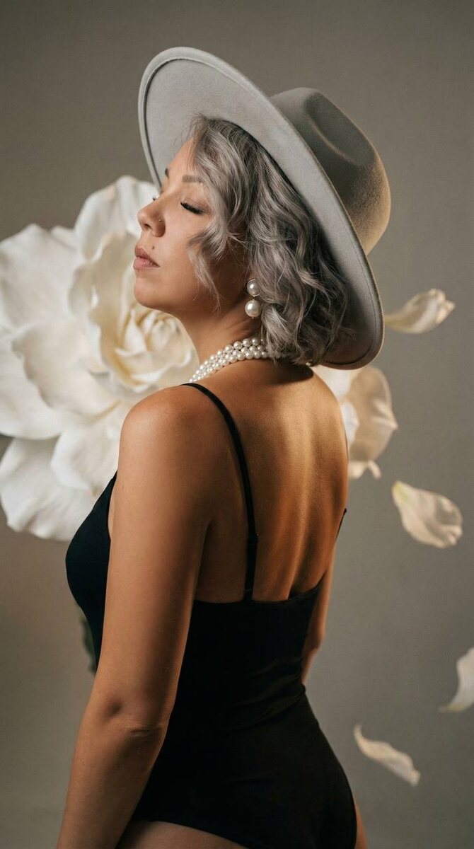 👇🏻 🌟Переходим на удобный сервис для генерации: Ссылка 👉 Syntx Ai Ссылка 👉 Veo3 📌ИНСТРУКЦИЯ ПО ИСПОЛЬЗОВАНИЮ В ЗАКРЕПЛЕННЫХ СООБЩЕНИЯХ ◾️ПРОМТ : Не меняя внешности женщины с фото, вид сбоку, подчёркнута стройная спина в черном облегающем боди с тонкими бретелями, частично скрыто. Волосы цветом как на фото, короткие, но густые, с объемом у Корней, слегка волнистые .Легкий отблеск света играет на загорелой коже, подчеркивая плавные тени вдоль позвоночника и плеча. Голова приподнята и откинута назад, взгляд в сторону, закрыт. Широкополая светло-серая шляпа с матовой текстурой создаёт винтажную меланхоличную атмосферу. Крупные жемчужные серьги и многослойное ожерелье добавляют роскоши, бусины блестят в рассеянном свете. На размытном фоне крупный план белого цветка с мягкими лепестками, вокруг плавно парят лепестки, создавая движение и лёгкость. Однотонный серо-бежевый фон контрастирует с элементами женщины и цветка, усиливая фокус, с легкой романтикой и чувственностью. Полуте