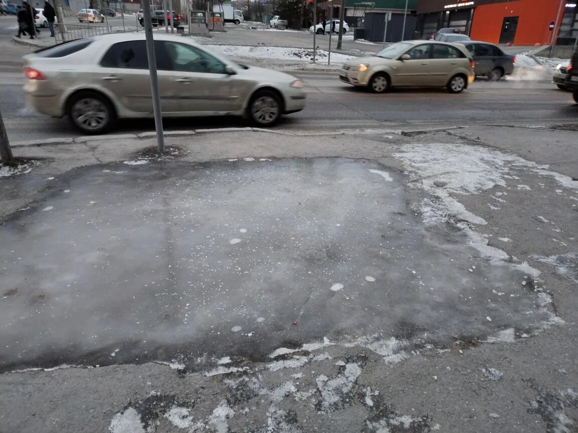 Снег смыло, а асфальт почему-то сухой. Почему? Я понимаю, когда асфальт в центре сухой. Высушили к празднику! За одну ночь.