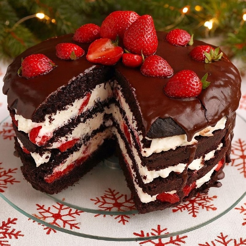 11. Сборка: корж — крем — клубника — крем — следующий корж. Повторять до конца. Верх и бока покрыть кремом.