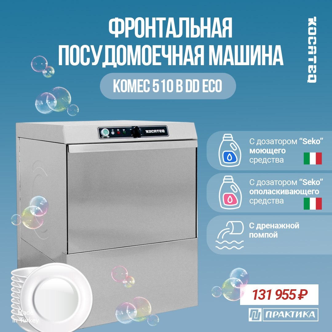ПММ KOCATEQ KOMEC 510 B DD ECO - это как раз тот случай, когда продуманы и учтены все важные детали. У модели есть 3 ключевых преимущества, на которые действительно стоит обращать внимание при выборе профессиональной посудомоечной машины: 1️⃣ Встроенный дозатор моющего средства Не нужно каждый раз отмерять химию вручную. Машина сама подаёт нужное количество моющего средства в нужный момент цикла. Это стабильное качество мойки, экономия химии и меньше ошибок со стороны персонала. 2️⃣ Встроенный дозатор ополаскивающего средства Ополаскиватель отвечает за блеск и быструю сушку посуды без разводов. Посуда выходит чистой и сухой сразу после мойки, без дополнительной протирки, особенно это важно для стеклянных стаканов и приборов. 3️⃣ Наличие дренажной помпы Дренажная помпа принудительно откачивает грязную воду. Машину можно установить даже там, где слив расположен выше уровня пола. Плюс - стабильный и быстрый слив без сюрпризов в работе. Почему на это стоит обращать внимание? Эти опции