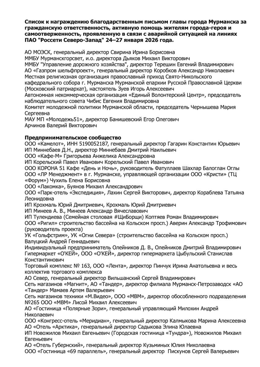 за гражданскую ответственность, активную помощь жителям города-героя и самоотверженность, проявленную в связи с аварийной ситуацией на линиях ПАО «Россети Северо-Запад» 24-27 января 2026 года. Посчитал необходимым опубликовать полностью. ❄ «Арктический Обозреватель» // #ДаБудетСвет