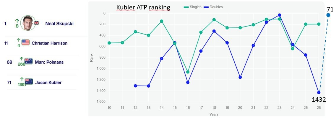 ! 🚀 Джейсон Кублер взлетел с 1432-го места на 71-е! Это рывок на 1361 позицию, даже больше, чем когда он выиграл AO в парном разряде в 2023 году. 🤯 На графике видно, как менялся рейтинг Кублера в одиночном и парном разрядах с 2019 по 2023 год. 📈 Подпишись на Эйс и точка