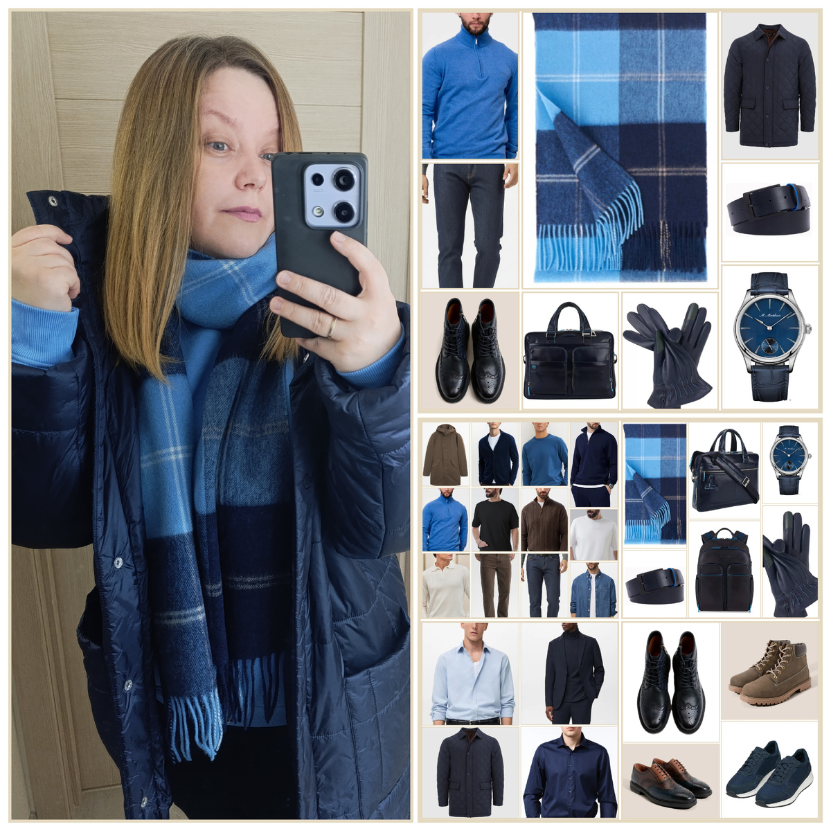 Все естественно проверяю на себе. Ну, а цвет к его голубым глазам очень подходит. Как и к часам, про которые я рассказывала в прошлой серии. Он у меня вообще в большинстве своем носит синий и коричневый. Так что идеи какие цвета сегодня собрать, я брала с его личных предпочтений. Теоретически можно встроить и тот кашемировый шарф, который я выбрала для себя. Но, я его не отдам. Буду носить сама и радоваться. Скоро и на него сделаю обзор.