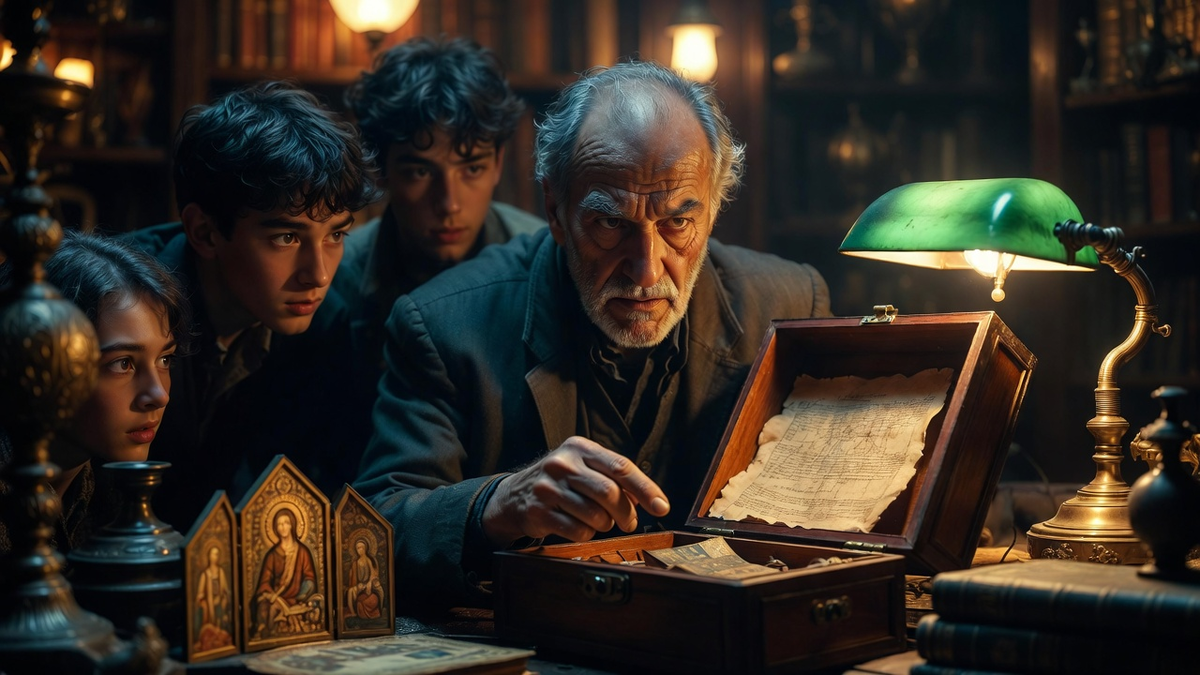 Лавка антиквара Искендера пряталась в глухом переулке района Балат, за неприметной дверью с потускневшей медной табличкой. Внутри царил полумрак, нарушаемый лишь светом одной лампы под зелёным абажуром, и стоял запах старой бумаги, воска и сухого дерева. Полки до потолка были заставлены книгами, шкатулками, странными приборами и обломками керамики. За массивным столом, покрытым ковром, сидел сам Искендер — мужчина преклонных лет с лицом, испещрённым морщинами, как старинная карта, и пронзительными, молодыми глазами. Он молча выслушал их сбивчивый рассказ, который они свели к поиску исторических контекстов для некой академической работы о византийских символах. Его взгляд скользнул по их лицам, затем остановился на рюкзаке Артёма, будто видел сквозь ткань. Когда Артём, не выдержав, осторожно положил на стол кожаную карту-схему, старик не проявил удивления. Он лишь достал из кармана жилета лупу в серебряной оправе и долго изучал изображение, водил пальцем по линиям, бормоча что-то на неп
