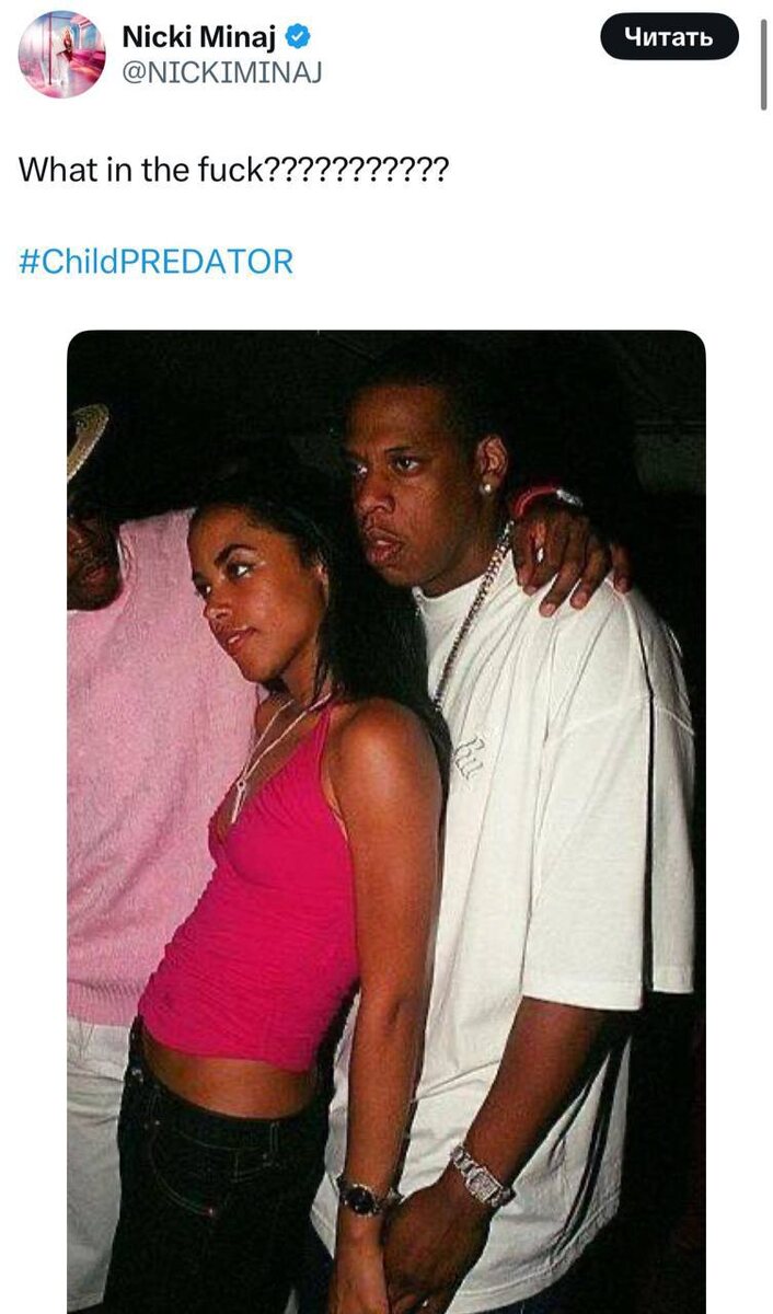 Вообще Никки Минаж, судя по активности в X за последние сутки, с головой погрузилась в конспирологию и эпштейновские файлы. Вот что пишет: Мужа Бейонсе рэперша обличает в «эпштейновских» наклонностях. Имя Джей Зи вроде и правда всплыло в файлах, в X пишут, что якобы одна из жертв очнулась в окружении рэпера и двух главных голливудских насильников - Эпштейна и Вайнштейна. Мифическое лобби во главе с Джей Зи, по версии рэперши, саботировало документалку Минаж об абьюзе в музыкальной индустрии. Какого-то «всеми любимого артиста» Минаж записала в запрещенные в РФ сатанисты, которые занимаются жертвоприношениями. А ведь когда-то вместо рвали эфира в коллабе Йе Monster. Ну, и в довесок от отмененной рэперши досталось певице Лиззо, которая в TikTok записала видео в защиту Джей Зи (правда уже его удалила).