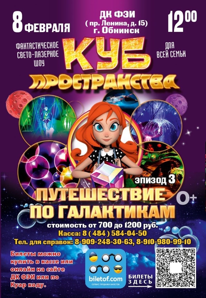 Эпизод 3». Удивительные приключения обычной девочки, путешествующей по Вселенной с помощью случайно попавшего к ней Куба пространства — артефакта, созданного древней космической цивилизацией. Захватывающий сюжет, удивительные жители других планет, с которыми предстоит встретиться и подружиться главной героине, неожиданные приключения и непростые решения, которые придётся ей принимать, — всё это заставит вас полностью погрузиться в фантастический мир этого шоу. Самое современное световое, лазерное и специальное сценическое оборудование, управляемое компьютерной системой, уникальные образы героев и декорации, включая радиоуправляемые светодиодные костюмы ряда персонажей, интерактивы со зрительным залом — всё это оставит незабываемое впечатление даже у самого искушённого зрителя. 🎟Билеты в кассе (Вт-Сб с 13:00 до 19:00) или онлайн по ссылке: https://biletof.com/action/?ra=18293&frame=1. Обнинск, пр-т Ленина, 15. 👍 Подписаться | Ваша реклама