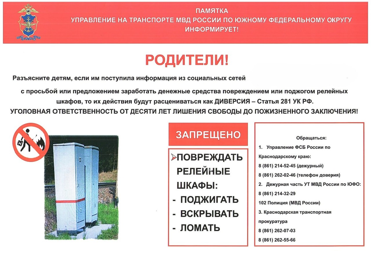 : Повреждение или поджог релейных шкафов расценивается как диверсия – статья 281 УК РФ. Максимальное наказание – до пожизненного лишения свободы. Если вам или вашим близким через соцсети или мессенджеры поступило сообщение с просьбой или предложением заработать деньги путём повреждения или поджога релейных шкафов, необходимо незамедлительно обратиться в: 🔸 Управление ФСБ России по Краснодарскому краю: 8(861)214-52-45 (дежурный) 8(861)262-02-46 (телефон доверия) 🔸 Дежурная часть УТ МВД России по ЮФО: 8(861) 214-32-00 🔸 Дежурная часть Краснодарского ЛУ МВД России на транспорте: 8(861) 214-75-87