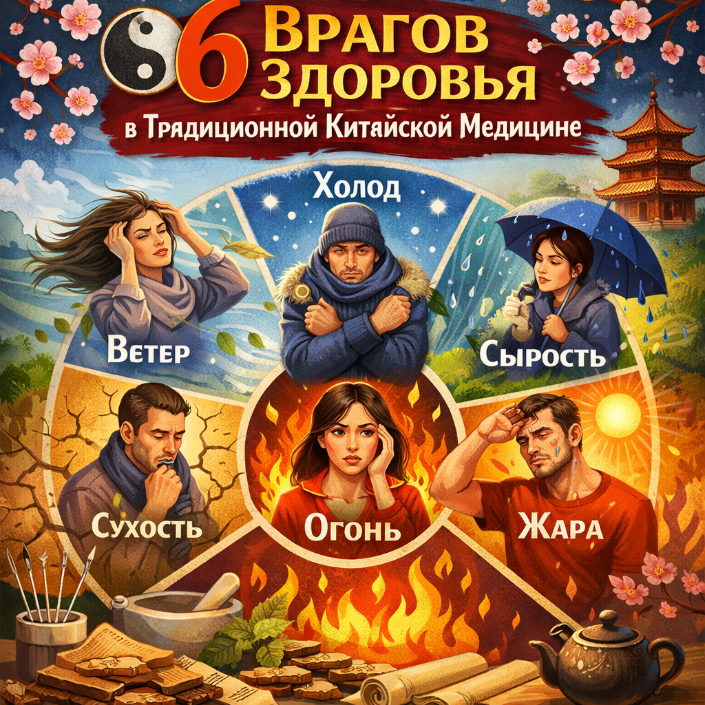 Когда этот баланс нарушается, возникают болезни. Одной из ключевых причин таких нарушений считаются так называемые шесть внешних патогенных факторов, которые в ТКМ называют «врагами здоровья». Ветер считается главным внешним фактором, через который в тело проникают другие патогенные влияния.