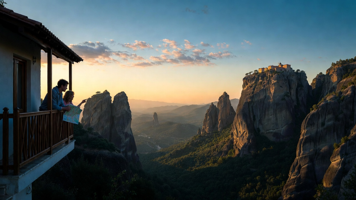 В Салониках они пересели на местный автобус до городка Каламбака — воротам к Метеорам. Пейзаж за окном менялся: сначала равнины, потом предгорья, и наконец, вдали, стали показываться фантастические силуэты — гигантские каменные столпы, увенчанные монастырями, будто парящими в облаках. Вид был настолько нереальным, что на мгновение заставил забыть обо всех опасностях. Это было то самое место — где земля касается неба.