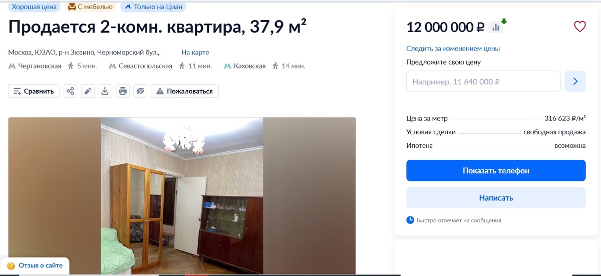 Продолжаю традиционный обзор рынка жилой недвижимости ЮЗАО. Сегодня посмотрю, что происходит с маленькими “двушками”. В силу небольшой площади такие квартиры подходят не всем, но они стОят дешевле остальных, а значит круг их потенциальных покупателей шире. Одна из таких небольших квартир была, на протяжении полугода, “героиней” моей рубрики НеБольшой ремонт, которая завершилась на прошлой неделе. Условия прежние - внутри МКАД, дома от 9 этажей, НЕ первый этаж, разумная доступность от метро, не аукцион (то есть квартиру можно купить по цене в рекламе). На первом месте сегодня квартира на Черноморском бульваре. Обычная квартира без балкона, что печально. Квартира в жилом состоянии, но ремонта не было с момента постройки дома. Есть паркет. Мне нравится, но думаю что многие предпочтут от него избавиться. Нормальные фото, есть планировка (молодцы!). Про документы - ничего и это настораживает :) Квартира находится относительно недалеко от м. Чертановская, требует ремонта. Цена 12 млн. (317 к