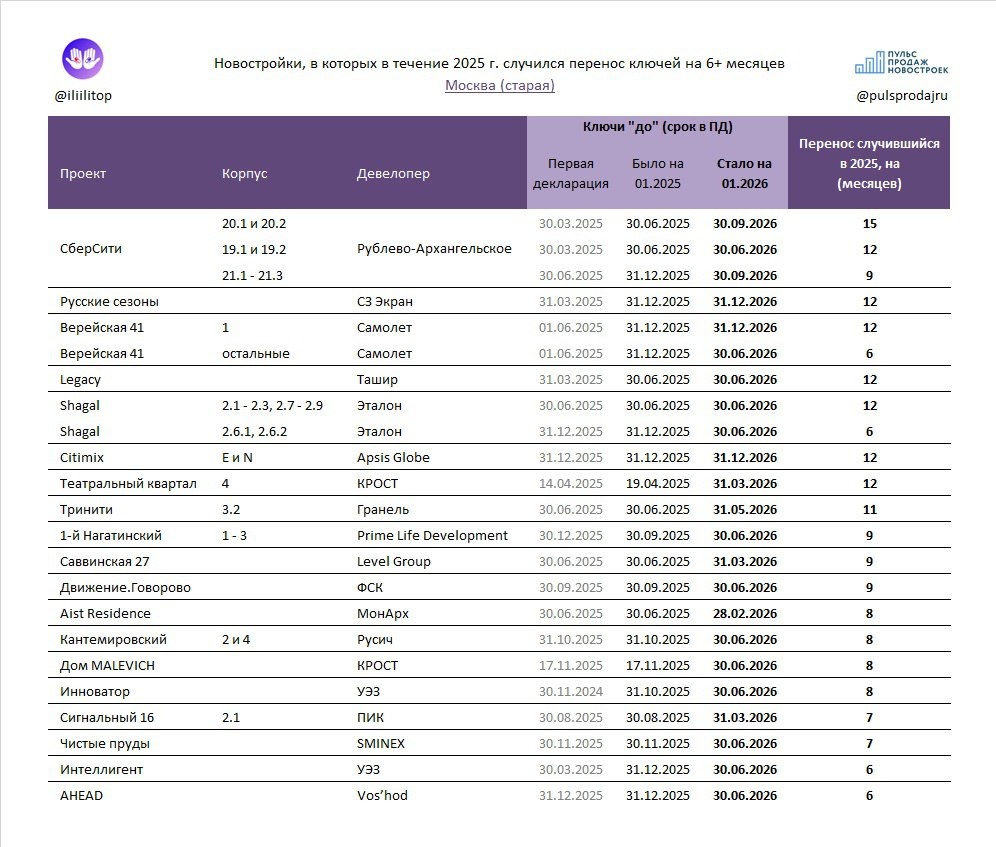 Собрали с Пульсом новострой старой Мск, который не успели сдать, и перенесли ключики на 6+ месяцев Да, ещё были переносы на 2026-ой в Руставели 14, Амурском Парке, MODе, Острове 6 и других проектах... Но их хотя бы ввели, и таки начала раздавать дольщикам Длительность переноса считал от дат обещаний из деклараций января 2025 и текущей. Помним, что переписывать сроки могли и раньше. Поэтому, для справки добавил дату в самой первой ПД-шке. Лень считать на какие суммы и под какие сроки заключилось ДДУ в этих корпусах. Однако, полагаю, потенциальные размеры неустоя тут будут приличными Отдельно отмечу антикейс ФСК с Движение.Говорово. В котором в середине года, в экстазе демпинга, слили тыщу апартов, распродав проект ниже себеса. Так ещё и попадут теперь на штрафняки. Просчитались, но где )) В Новой Москве главный переносчик - Самолет. Табличкой поделюсь позже. Если такое вам любопытно 👍 @iliilitop