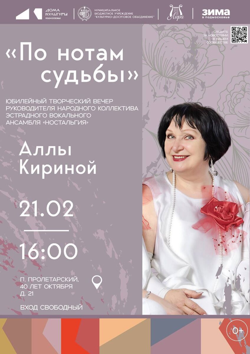 «По нотам судьбы» Есть люди, чья жизнь — как красивая мелодия. И 21 февраля у вас есть уникальный шанс услышать её «вживую»! Приглашаем на тёплый, душевный и музыкальный вечер, посвящённый юбилею Аллы Кириной — человека, который многие годы дарит нам песни, вдохновение и создаёт магию на сцене вместе с Народным коллективом эстрадного вокального ансамбля «Ностальгия» Этот вечер — благодарность ей и подарок для всех нас. 👉 21 февраля в 16:00 👉 п. Пролетарский, ул. 40 лет Октября, 21 Вход свободный. Приходите сами, зовите друзей — подарите себе вечер прекрасной музыки!