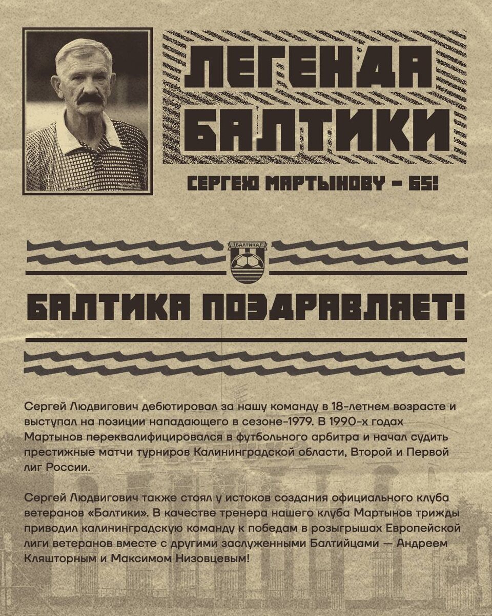 🥳 Сегодня свой 65-й день рождения празднует руководитель объединения заслуженных Балтийцев Сергей Мартынов! Сергей Людвигович дебютировал за нашу команду в 18-летнем возрасте и выступал на позиции нападающего в сезоне-1979. В 1990-х годах Мартынов переквалифицировался в футбольного арбитра и начал судить престижные матчи турниров Калининградской области, Второй и Первой лиг России. Сергей Людвигович также стоял у истоков создания официального клуба ветеранов «Балтики». В качестве тренера нашего клуба Мартынов трижды приводил калининградскую команду к победам в розыгрышах Европейской лиги ветеранов вместе с другими заслуженными Балтийцами — Андреем Кляшторным и Максимом Низовцевым! Мы поздравляем Сергея Людвиговича с юбилеем и желаем долгих лет жизни, крепкого здоровья и нескончаемого запаса сил! 🎂