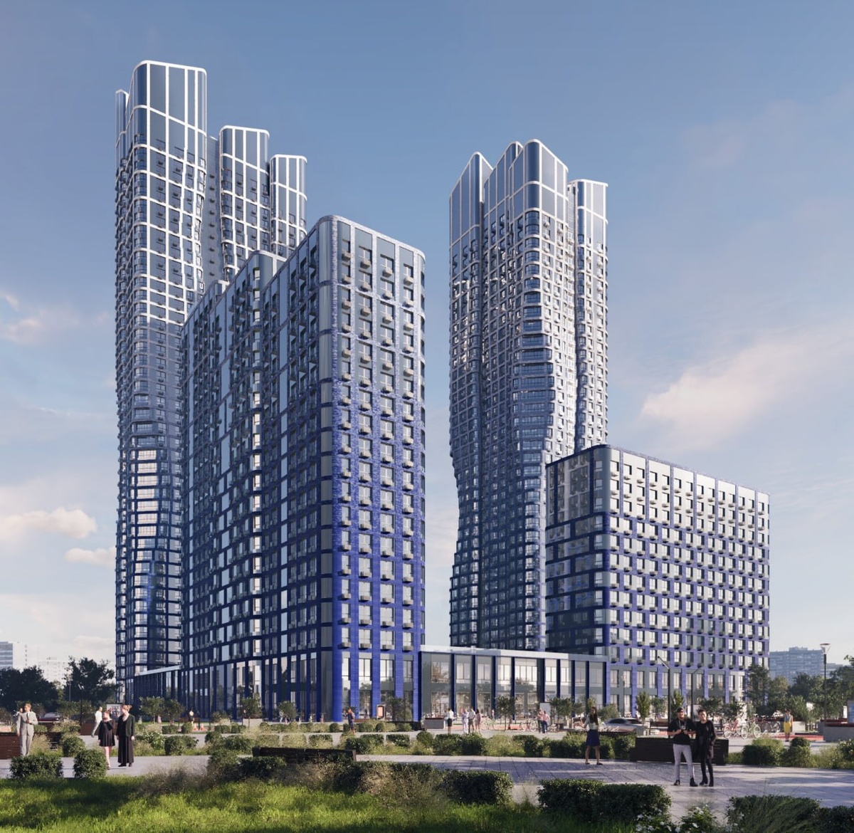 ) Из классики – в футуризм. На фасады первой очереди добавили синей краски. А две высотные башни – пошли волнами. Можно пошутить про корпоративный «синий» (Галс в группе ВТБ), но скорей всего концепт синевы и волн как-то связан с неймом жк Вообще, на картинках сейчас видим только первый квартал всего проекта. Таких будет три. Почти на 5000 квартир. Их соединит пешеходный бульвар с велодорожками. Плюс бахнут большой БЦ (около 97 тыс. м²). Ещё школа с садиком (575 и 300 мест), которые обещают сдать одновременно с 1 очередью. Ну и всяческая коммерция первых этажей... По 1-ой очереди, кратко: ▫️Позиционирование Бизнес-класс ▫️Корпуса 13–47 эт., на 1489 квартиры (28–99 м²). Потолки 2,95 м ▫️Текущая витрина (два корпуса) – без отделки. Но, шепчут, что в следующих появится чистовая ▫️В почве 535 парковок (0,36 м/м на лот). И 515 кладовок – внимание – на 2-ых этажах (удобно, не затопит, всегда сухо и чисто, но расточительно как-то для застроя) ▫️Гранд-лобби. Закрытый двор 0,5 га. С 2-ярусны