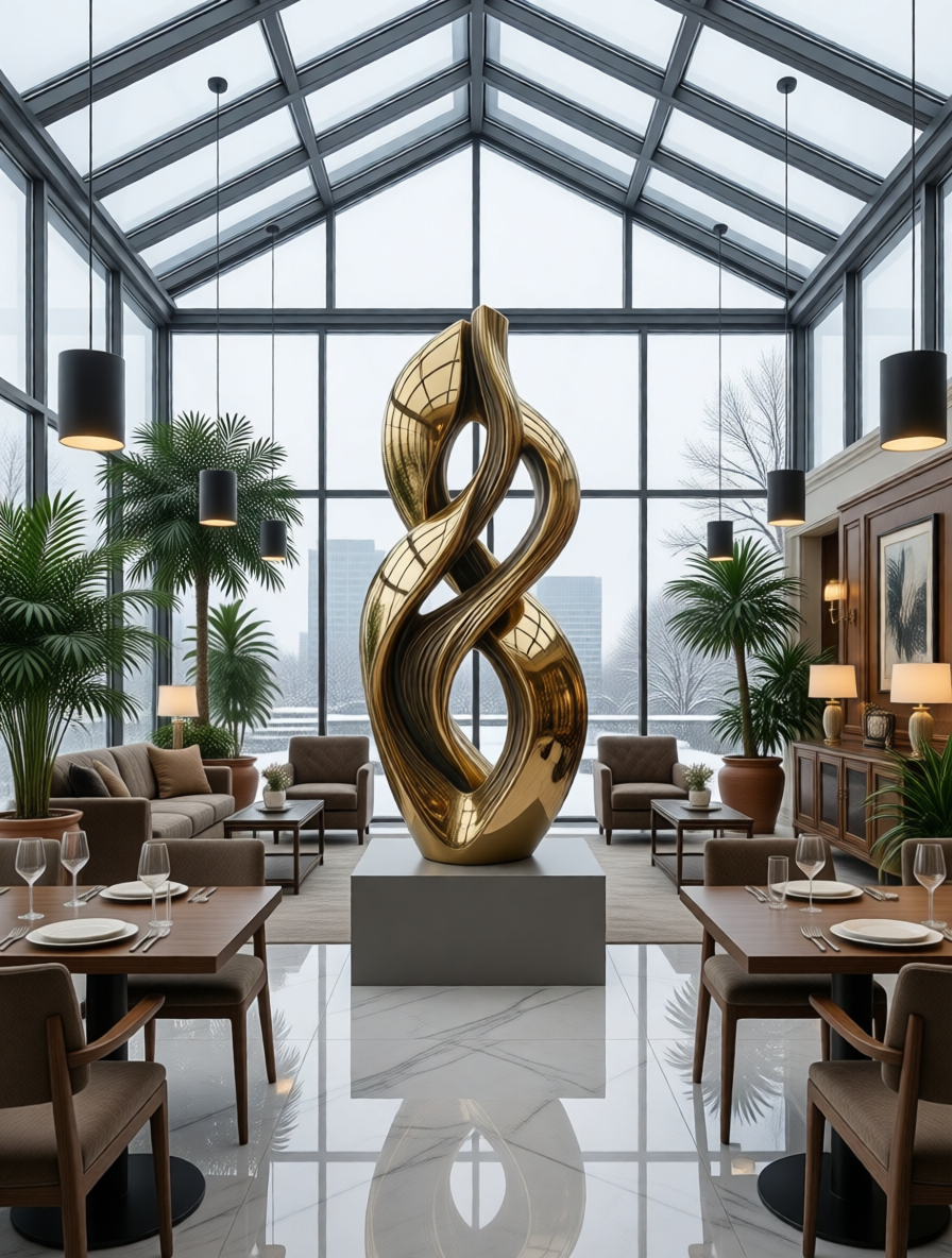 Давайте представим, что входя в холл большого особняка, взгляд невольно останавливается на центральном элементе интерьера — массивной скульптуре из латуни. Она стоит посреди мраморного пола, отбрасывая мягкие золотистые блики на стены, и становится не просто украшением, а душой пространства — тихим свидетелем приёмов, встреч и мимолётных моментов жизни дома.