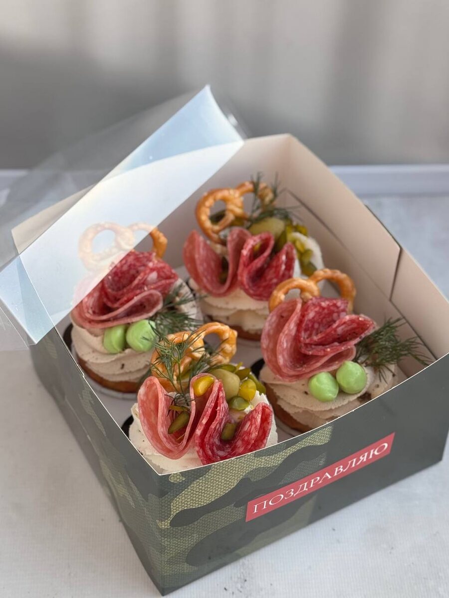 Дата выдачи обсуждается индивидуально 1) Закусочные сырные капкейки. В составе кекс с пармезаном и творожным сыром. В декоре шапочка с творожным сыром, специями и ферментированным черным чесноком ( он дает пряный и необычный вкус, а не остроту). Украшено несколькими видами колбасы,сыром,фисташкой( как на примере) Цена набора из 4 штук 2000₽ 2) Шоколадная колбаса( из песочного печенья собственного производства) Вес около 250 грамм, цена 900₽ за одну палку Обязательно предварительное бронирование. Из наличия будут только остатки