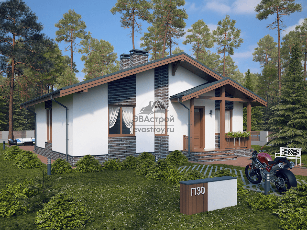 Номер проекта: 106-51 (П30) Разделы проекта: Архитектурный и Конструктивный разделы Узнать о проекте больше можно на сайте evastroy.ru или по телефону +7 (495) 175-30-40 Представляем одноэтажный дом площадью 112 м2 и габаритами 12.5 x 13.5 м. Проект отличается, с одной стороны, простотой решений, а с другой — необычайной практичностью и функциональностью. Семья из 3-4 человек найдет здесь достаточно места. Помимо уютной гостиной, объединенной кухней-столовой, в распоряжении жильцов: 3 спальни, санузел с душем, котельная с возможностью установки стиральной машины, удобная крытая терраса. Дом начинается тамбуром, откуда есть выход в котельную. Котельную одновременно планируется использовать как прачечную и дополнительный санузел. В передней части г-образного холла установлен шкаф для верхней одежды. Гостиная и кухня-столовая объединены в общую дневную зону, с выходом на террасу из гостиной. В кухне-столовой — угловой рабочий гарнитур с мойкой у окна и 6-местный обеденный стол. Камин расп