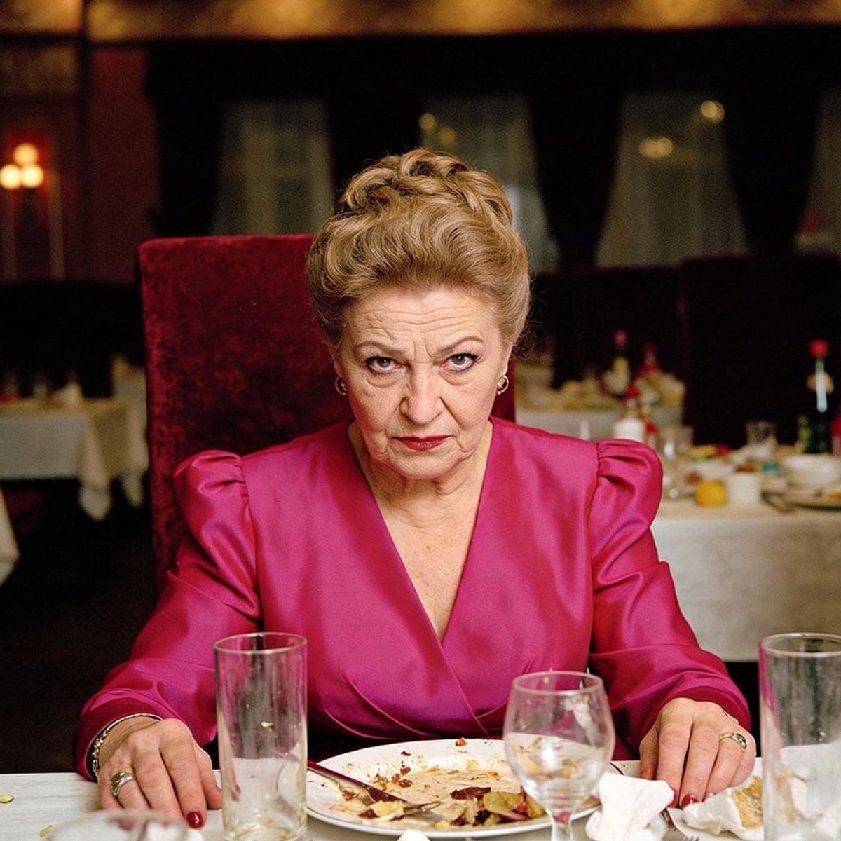На банкете свекровь сидела с каменным лицом, едва прикасаясь к еде. Когда к их столу подходили гости Насти, она изображала вежливость, но стоило им отойти, как тут же начинала шептать мужу: