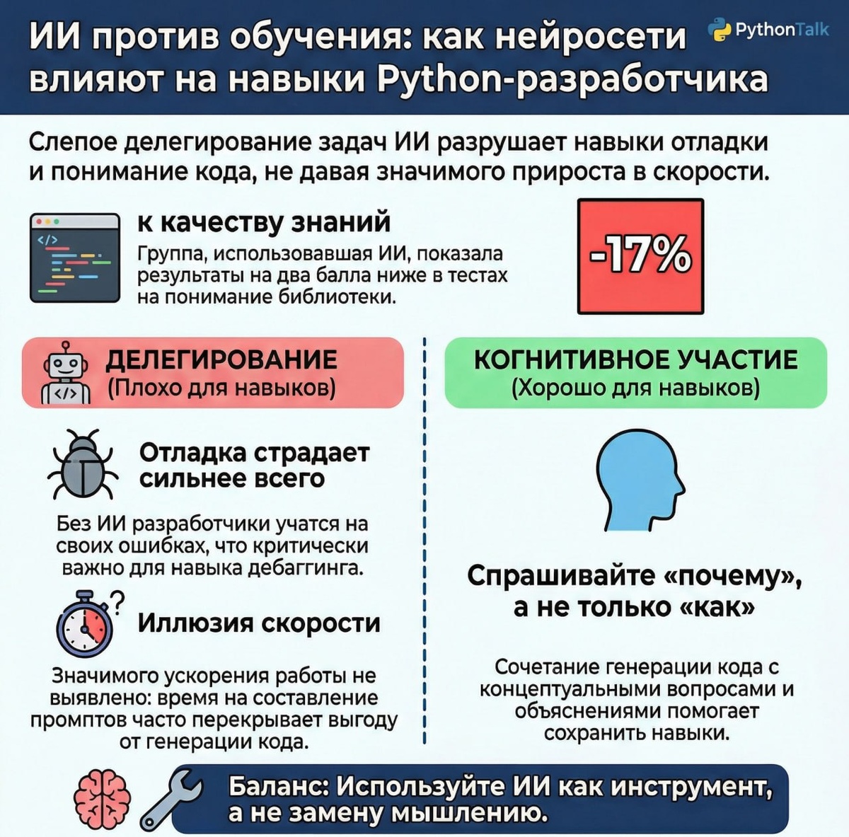 Пруфы от Anthropic 📉 Ребята из Anthropic (создатели Claude) выкатили исследование, в котором проверяют, как использование AI-ассистентов влияет на skill formation — то есть на то, как ваш мозг обрастает новыми нейронными связями при изучении незнакомых технологий. 🧪 Сэтап эксперимента: Взяли 50+ разработчиков. Дали задачу на Python с использованием библиотеки Trio (асинхронщина, которую мало кто знает, чтобы исключить фактор "я это уже учил"). Одной группе дали AI, другой запретили. Потом провели жесткий квиз на понимание того, что они вообще накодили. Результаты такие 👇🏻 1️⃣ Вы тупеете. Группа с AI написала тест на 17% хуже. Самый сильный провал — в вопросах на дебаггинг и концептуальное понимание. То есть код есть, а понимания, почему эта асинхронная кракозябра работает (или нет) — ноль. 2️⃣ Вы не становитесь быстрее. Вот это — главный удар под дых. Статистически значимого ускорения в группе с AI не обнаружено. Почему? Потому что "инженеры" тратили кучу времени на написание