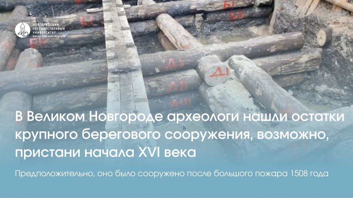 В Великом Новгороде археологами открыто уникальное деревянное сооружение из массивных брёвен на берегу реки Волхов. Учёные высказали предположение, что постройка может быть остатками судоходной пристани, построенной вскоре после большого пожара 1508 года. Сооружение открыто в раскопе на Софийской стороне, на берегу Волхова, около монумента Победы. Рядом находится кремль, на противоположном берегу — Ярославово дворище, где в древности находился Торг, центр экономической жизни города. В отличие от других исторических частей Великого Новгорода, прибрежная зона ещё мало исследована. — Это сооружение из очень мощных брёвен, преимущественно сосновых, диаметром до 50 сантиметров, — рассказал Пётр Гайдуков — советник директора Института археологии РАН, главный научный сотрудник кафедры истории России и археологии НовГУ. — Остатки сооружения спускаются к воде, их удалось проследить на протяжении 24 метров. Мы предполагаем, что это нижняя фундаментная часть крупного берегового сооружения, возмож