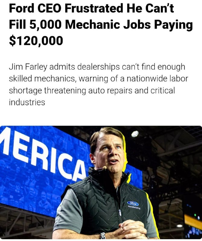 Прямо сейчас у Ford висит около 5 тысяч вакансий с зарплатой примерно 750 тысяч рублей в месяц, но подходящих рук почти нет. По версии главы компании, корень проблемы — в образовании США: колледжи качают гуманитариев и ИИ-спецов, а нормальные рабочие профессии задвинули. Итог предсказуем — молодёжь не идёт в цеха, а бизнесу приходится вылавливать кадры по регионам и через центры занятости. Похоже, заводчане — это новые айтишники, только без макбуков 🫠 Подробнее: https://hard-tm.su/threads/144286/ 🕹HARD-TM — Подписаться