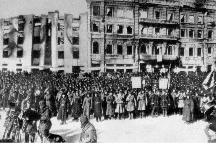 – Солнечным утром 4 февраля на площади Павших Борцов был назначен митинг, – говорил Василий Чуйков. – Бойцы и жители шли по заснеженным, изрытым бомбами и снарядами улицам города-героя. Как сейчас вижу обгоревшие вагоны на железнодорожных путях, изрешеченные пулями и осколками снарядов и мин трамваи, руины многоэтажных домов, улицы, запруженные разбитой военной техникой врага. В центре города сбитые немецкие бомбардировщики, обгоревшие стены центрального универмага, разрушенные здания почтамта и Дома книги. Бойцы, командиры и местные жители ( откуда они так быстро появились?), собравшиеся на площади, радовались победе, поздравляли друг друга. [...] Когда слово предоставили мне, сознаюсь, мне трудно было говорить. Увидев выстроившиеся колонны воинов, с которыми я пережил сто восемьдесят огневых дней и ночей, я заволновался...