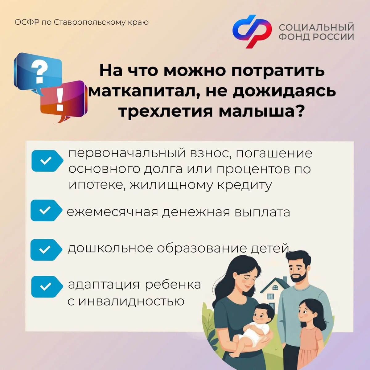 , накопительную пенсию родителя, социальную адаптацию и интеграцию в общество ребенка с инвалидностью. А остаток маткапитала до 10 тысяч рублей можно получить в виде единовременной выплаты 📑Большинство направлений доступно после того, как ребенку, с рождением которого возникло право на маткапитал, исполнится 3 года. ❗️Но есть исключения. 👆На что можно направить материнский капитал, не дожидаясь трехлетия малыша, смотрите в инфографике Отделения СФР по Ставропольскому краю ❤️ Подписывайтесь на Отделение СФР по Ставропольскому краю в Телеграм, чтобы быть в курсе актуальной информации. #СФР #маткапиталсфр #электронныеуслуги