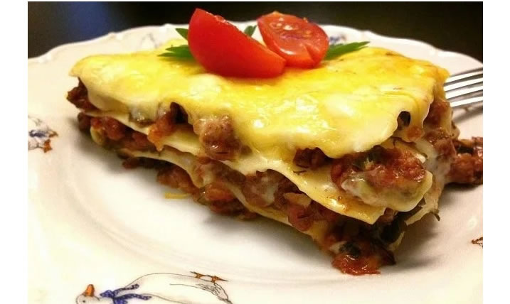- Соберите лазанью. Дно прямоугольной формы смажьте мясным соусом, закройте листами лазаньи. Положите несколько ложек мясного соуса, соуса бешамель, посыпьте натёртым сыром, затем снова листы лазаньи. Повторяйте 5–6 раз. Последним верхним слоем должны быть листы лазаньи. Смешайте остатки соуса бешамель с натёртым сыром и выложите сверху, на лазанью.