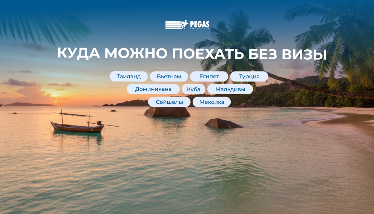 Планирование отпуска часто ассоциируется с бюрократией: анкетами, выписками из банков и ожиданием ответа от консульств. Однако мир гораздо доступнее, чем кажется на первый взгляд. Для граждан России открыто множество направлений, где для пересечения границы достаточно только загранпаспорта. Посмотрите на подборку ниже. Каждое из этих мест доступно для посещения без предварительного оформления визы — достаточно выбрать то, что вам ближе по настроению. Таиланд Вьетнам Египет Турция Доминикана Куба Мальдивы Сейшелы Мексика Китай Сербия Черногория Босния и Герцеговина Грузия Армения Латинская Америка (Аргентина, Бразилия, Перу) Многие считают, что безвизовые направления всегда дороже. Однако экономия часто достигается за счет отсутствия визовых сборов и возможности поймать «горящее» предложение в последний момент. В Пегас Туристик мы помогаем зафиксировать стоимость тура заранее. Раннее бронирование позволяет сохранить до 50% бюджета, особенно если речь идет о популярных семейных отелях, к