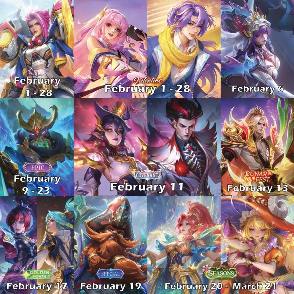 🔜1–28 Февраля Хильда — Guardian Battalion 🔜1 Февраля Ланселот — Blade of Devotion Одетта — Song of Devotion 🔜6 Февраля Вексана — Eternal Vows 🔜9–23 Февраля Атлас — Sunken Curse 🔜11 Февраля Эйдора — Midnight's Allure Натан — Sanguine Steward 🔜13 Февраля Леоморд — Auspicious Blaze 🔜17 Февраля Ханаби — Neonscape Icon Ханаби — Twin Crescent 🔜19 Февраля Франко — Captain of the Lost 🔜20 Февраля – 21 Марта Мия — Arrow of Spring Флорин — Herald of Autumn Выгодно и быстро пополнить алмазы Вы можете в нашем боте: @OneTwoPay_bot 🌟 Mobile Legends: Bang Bang