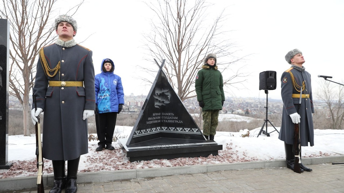 Мемориал ямальским защитникам Сталинграда установили в Волгограде. Церемония состоялась на главной высоте России. Фото: пресс-служба Волгоградской областной Думы В день 83-й годовщины Победы в Сталинградской битве на мемориальном кладбище на Мамаевом кургане состоялась церемония открытия памятного знака «Ямальским солдатам – защитникам Сталинграда». Памятник выполнен в виде чума – традиционного жилища исконных народов Крайнего Севера. Автором проекта стал член Союза архитекторов России, доцент ВолгГТУ Вячеслав Юшин. Право открыть мемориал предоставили участникам ямальского поискового отряда «Вектор»: ученику школы села Аксарка, правнуку участника Сталинградской битвы Кириллу Лаврову и студентке третьего курса Российского государственного педагогического университета А.И. Герцена Светлане Пандо. В мероприятии приняли участие председатель Волгоградской облдумы Александр Блошкин, руководитель Заксобрания Ямало-Ненецкого АО Сергей Ямкин, представители ветеранского сообщества и молодежных п