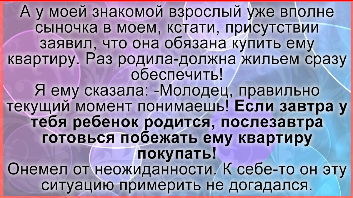 Я ему сказала: -Молодец, правильно текущий момент понимаешь! Если завтра у тебя ребенок родится, послезавтра готовься побежать ему квартиру покупать!