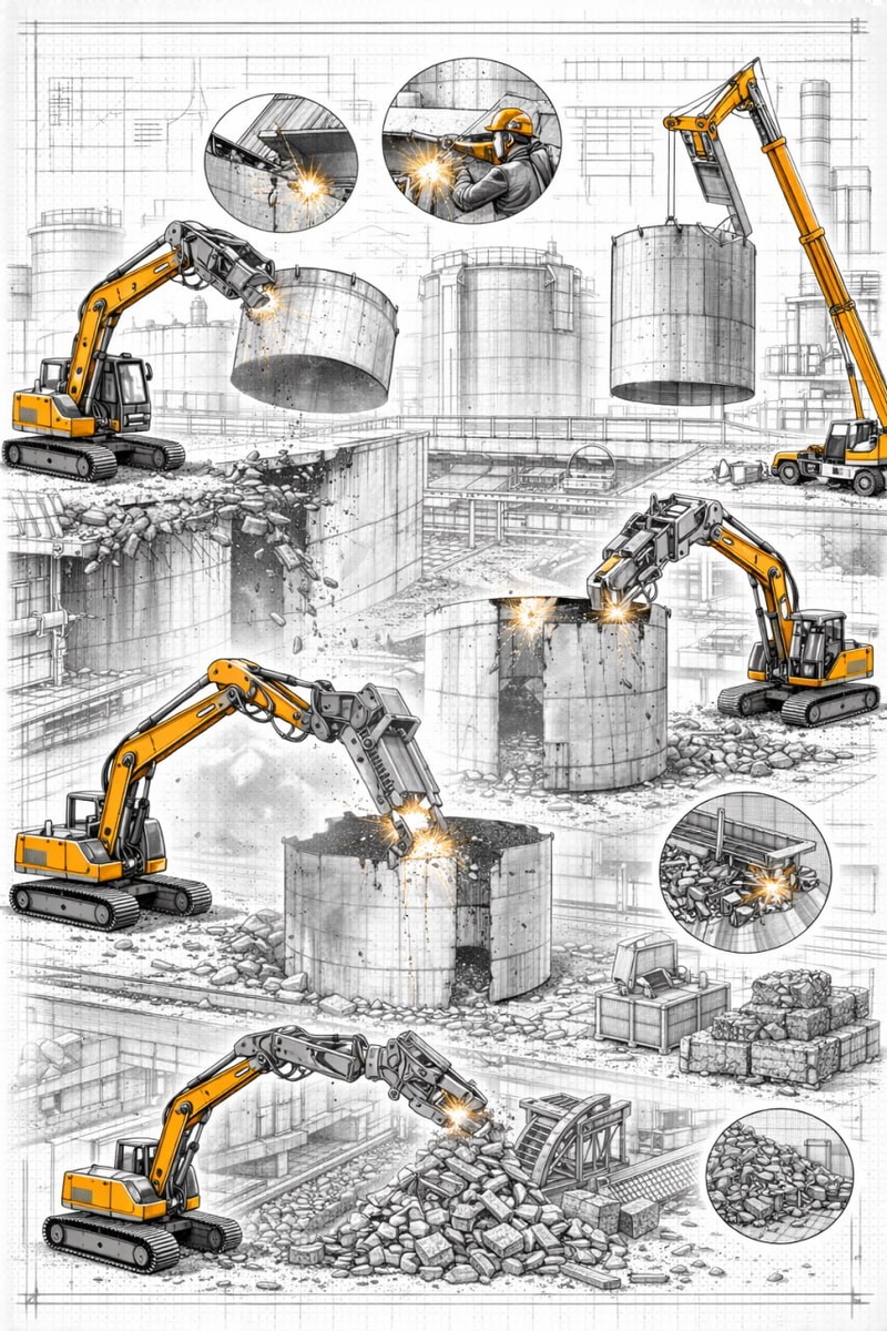 ГК АНТ ТЕХНИК выполняет специализированные работы по демонтажу резервуаров, предназначенных для хранения жидких и газообразных веществ, включая промышленные, технологические и складские ёмкости различного объёма и конструктивного исполнения. Данный вид работ относится к категории повышенной опасности и требует строгого соблюдения технологических регламентов и мер безопасности на всех этапах реализации проекта. Перед началом демонтажных работ специалисты ГК АНТ ТЕХНИК проводят комплекс подготовительных мероприятий, включающих очистку внутренних поверхностей резервуаров от остатков продуктов, дегазацию и контроль отсутствия взрывоопасных и токсичных концентраций. Все процедуры выполняются с обязательным инструментальным контролем и документальным подтверждением безопасности объекта для дальнейших работ. В зависимости от конструкции резервуара, его технического состояния и условий площадки применяются различные технологии демонтажа. ГК АНТ ТЕХНИК использует методы холодной и горячей рез