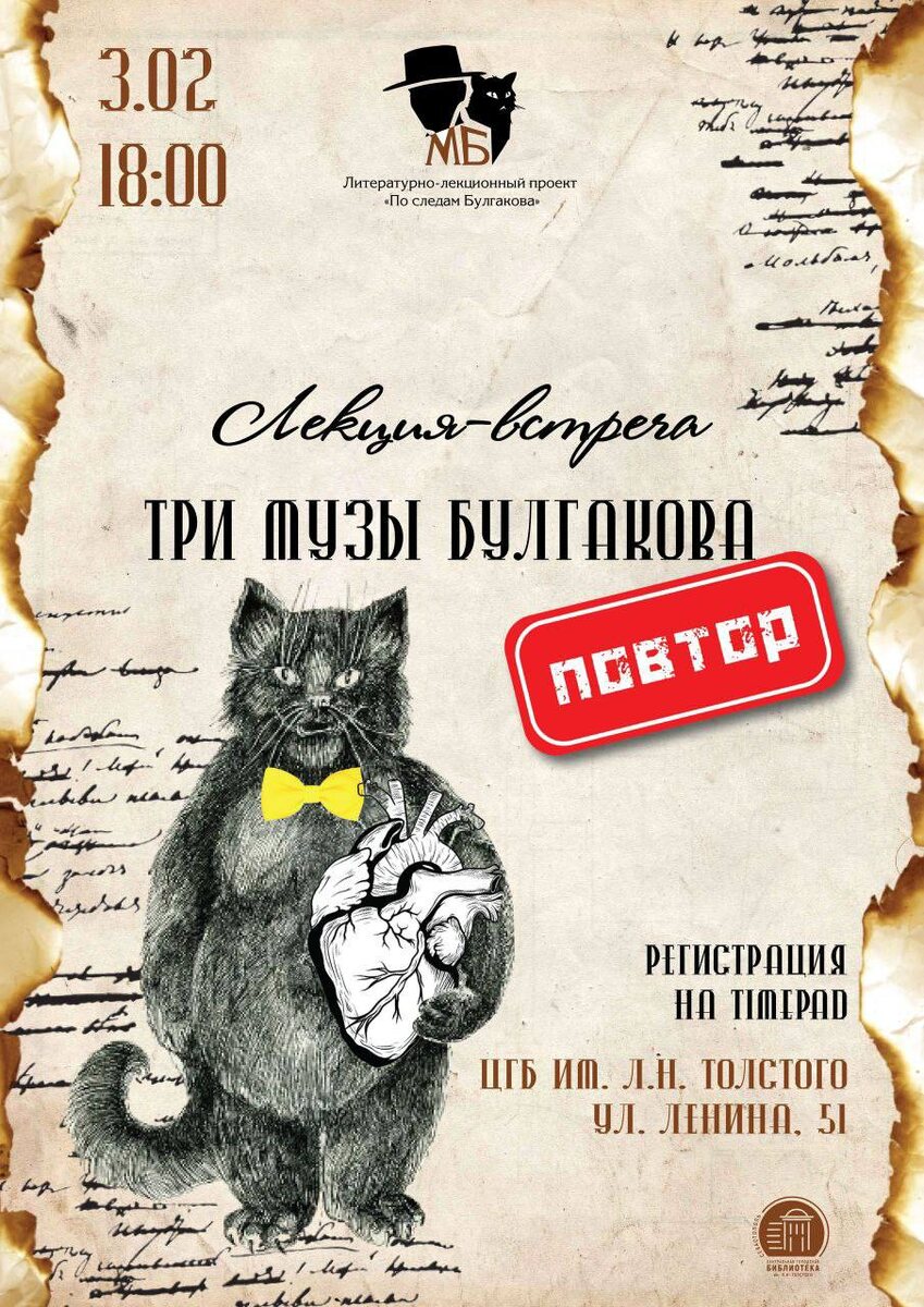 📋 Сходим на лекцию «Три музы Булгакова» 👉 Когда? 3 февраля в 18:00 👉 Где? ул. Ленина, д. 51, Библиотека им. Л.Н. Толстого 👉 Участие бесплатное, предварительная регистрация обязательна 👉 Возрастные ограничения 16+ ✨Давай сходим, Севастополь | Читайте и смотрите нас в МАХ