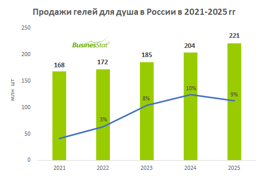За 2021-2025 гг продажи гелей для душа в России увеличились на 32%: с 168 до 221 млн шт.