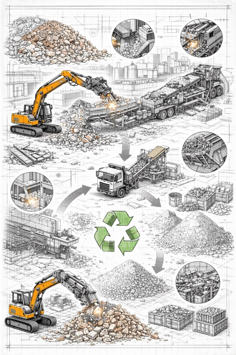 ГК АНТ ТЕХНИК рассматривает рециклинг материалов демонтажа как неотъемлемую часть комплексного подхода к выполнению работ. Переработка отходов позволяет не только оптимизировать логистику и снизить затраты заказчика, но и обеспечить экологически ответственное ведение строительной деятельности. В рамках рециклинга ГК АНТ ТЕХНИК осуществляет переработку бетонных, кирпичных и железобетонных фрагментов, образующихся при демонтаже зданий и сооружений. С применением специализированного дробильно-сортировочного оборудования демонтажные отходы перерабатываются во вторичный щебень различных фракций, пригодный для повторного использования. Процесс рециклинга включает поэтапную сортировку материалов, удаление посторонних включений, извлечение металлической арматуры и последующее дробление с контролем качества получаемого продукта. Такой подход позволяет получать вторичные строительные материалы, соответствующие требованиям для использования в дорожном строительстве, благоустройстве территорий и