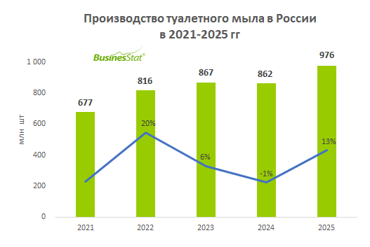 В 2025 г производство туалетного мыла в России выросло на 13%: с 862 до 976 млн усл шт.