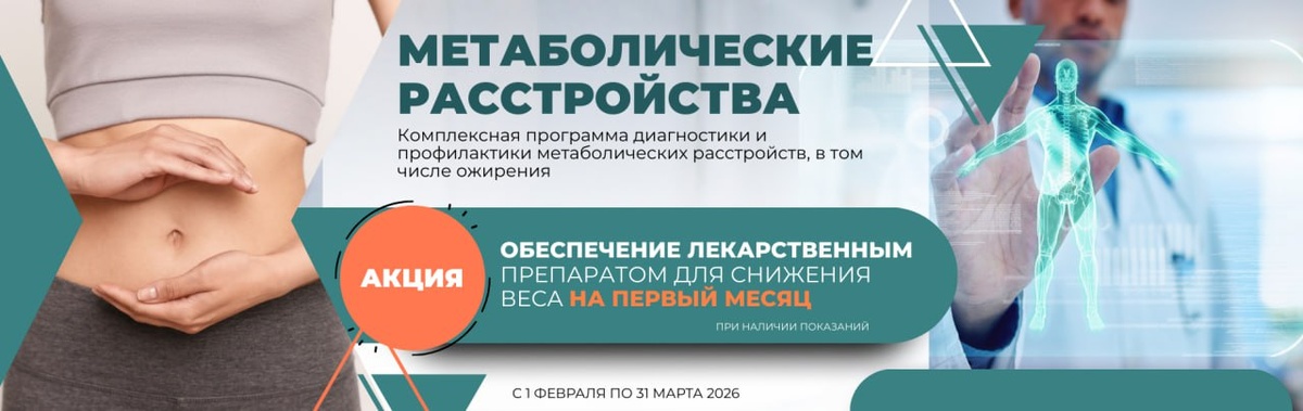 ! В преддверии Дня защитника Отечества и Международного женского дня запускаем акцию: комплексная диагностика и лечение метаболических расстройств. Мы поможем вновь почувствовать легкость в теле и радость от отражения в зеркале! В отделении диетологии вы можете пройти комплексную программу диагностики для выявления нарушений обмена веществ на ранней стадии. Для снижения риска развития осложнений команда специалистов разработает персонализированное лечение метаболических расстройств, в том числе ожирения, для конкретного пациента. Если вы проходите нашу программу с 1 февраля по 31 марта, то в подарок получаете современный и надежный препарат для снижения веса. Для чего вам нужна программа диагностики? ✔️Улучшить здоровье и качество жизни. ✔️Узнать причину набора лишнего веса. ✔️Снизить риски развития серьезных заболеваний. Любовь к себе начинается с заботы о самочувствии!🤍 Записаться на диагностику и начать новый, счастливый период вашей здоровой жизни можно, позвонив сотруднику
