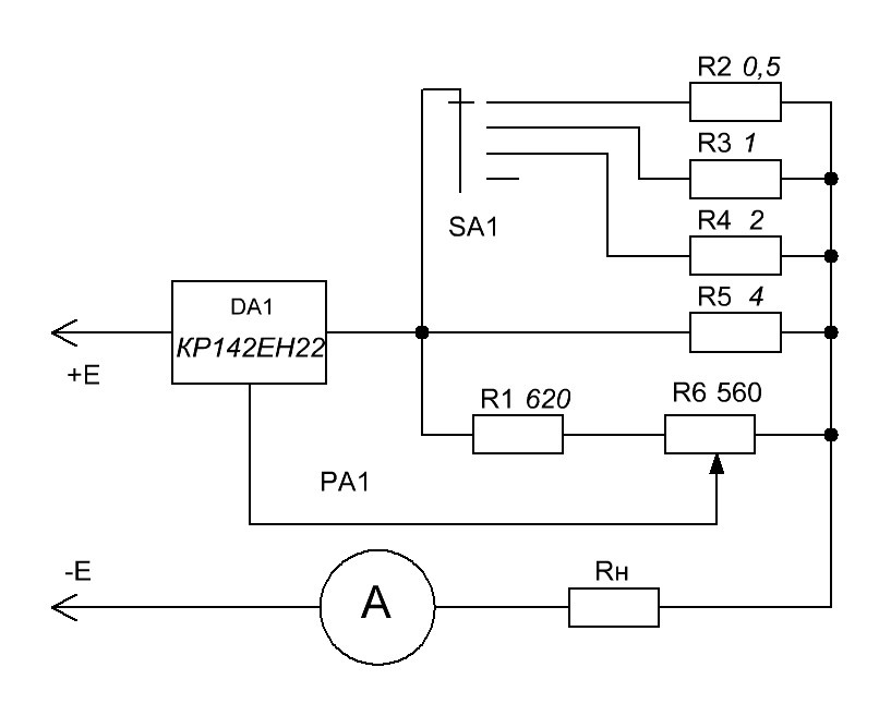 Регулируемый стабилизатор тока на К142ЕН22. Стабилизатор тока используется для питания нагрузок при различных возмущающих факторах – входного напряжения, сопротивления нагрузки и др. Простые схемы таких устройств реализуются на трехвыводных стабилизаторах фиксированного напряжения серии 78ХХ и 79ХХ. При этом для плавного регулирования тока в широком диапазоне необходим мощный потенциометр. На рис.1 показана схема такого стабилизатора тока. Генерируемый ток определяется величиной сопротивления резистора R1, который может находится в пределах от 0,8 Ом до 120 Ом. Протекающий через нагрузку ток определяется по формуле Iout = 1.25/R1, где R1 в Ом. Если в нагрузке течет ток в 1А, то такой же ток течет и в резисторе R1.Для реализации плавного регулирования тока потребовало бы потенциометр с сопротивлением в 120 Ом с рассеиваемой мощностью в 120Вт. Но такая величина неприемлема. На рис.2 показана схема с регулируемым трехвыводным интегральным стабилизатором свободным от этого недостатка. В эт