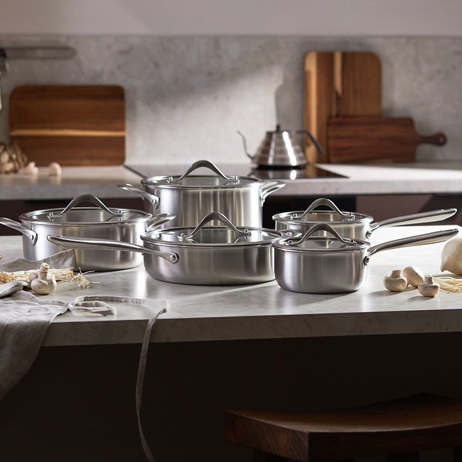 Посуда из нержавеющей стали давно считается базой современной кухни. Её выбирают за универсальность, долговечность и аккуратный внешний вид. Но именно вокруг нержавейки возникает больше всего вопросов: почему появляются пятна, откуда берется радужный налет, можно ли мыть в посудомойке и что делать с пригоранием. Хорошая новость в том, что нержавеющая сталь — один из самых устойчивых материалов, если понимать, как он работает. Разберёмся, как ухаживать за такой посудой грамотно. На фото: Коллекция 3Ply Etalon от Liberty Jones Нержавеющая сталь — это сплав железа с хромом (обычно не менее 10,5%), иногда с добавлением никеля и молибдена. Именно хром образует на поверхности тонкую защитную плёнку, которая препятствует коррозии. Важно: эта плёнка самовосстанавливающаяся, но только при правильных условиях эксплуатации. Согласно ASM Handbook: Stainless Steels (ASM International), устойчивость нержавейки напрямую зависит от состояния поверхностного оксидного слоя. Даже качественная посуда може