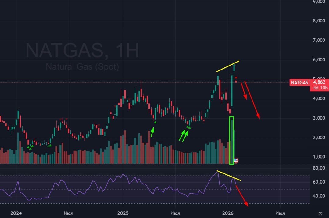 ⛽️ ГАЗ 🟢В прошлом посте про газ я обращал внимание,что у нас есть на 4-х часах накопление, которое как правило заканчивается выносом. Вынос этот случился в пятницу. То есть логика была верной, но отторговать ее идеально не получилось. Сегодня цена находится уже ПОД этим накоплением, что г7оворит мне о том. что бычки заперлись. Теперь, их, по логике, нужно будет отвезти на МК. По графику NATGAS наступление МК произойдет на уровне 3,0. 🟢Что по графику? Дивергенция сильнейшая на недельном тайм фрейме, огромнейшие объемы на позапрошлой неделе, что указывает на экстремум. Ложный вынос вверх из накопления, уход ниже накопления, сигналы на покупку отработаны, и появился сигнал на продажу (он должен сохраниться до конца недели, чтобы его брать в зачёт). 🚗 Чисто субъективный взгляд, не являюсь волновиком, прогонщиком, погодником, и прочим, жду газ вниз. Минимальная цель 4.0, идеально - 3,0 по графику Natgas #газ #ng1 #американскийгаз #фьючерсгаза #naturalgas #bogdanoffinvest $NGH6 $NGG