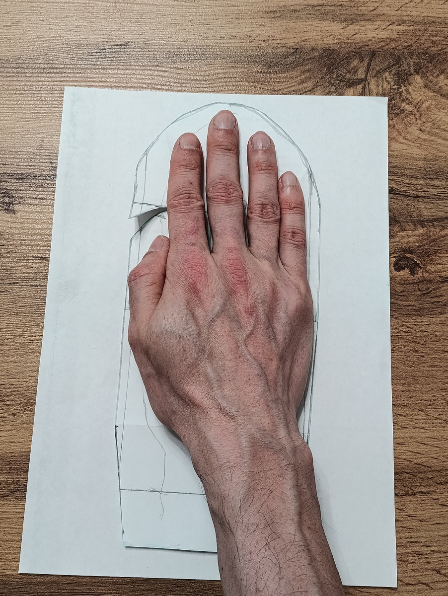 После первого варианта варежек. Которые у меня забрали. Я решил сделать себе вариант второй. Ну и переделал заодно выкройку. Прибавил 1 см в ширине и сместил в выкройке под большой палец на 1 см. И добавил 2 см на подгиб. Ссылка на первый вариант Вырезал согнул и получилась выкройка на три детали. На фото выше нижняя часть с большим пальцем. А на фото далее верхняя часть. Палец получился уже немного с изгибом. И на готовом изделии это уже удобнее. Далее вырезаем детали. Футер трёх нитка с начёсом. А потом флис. Обрезки пошли в ход. Разложил детали. Заодно чтобы посмотреть как будет. Решил сразу сшивать все. А потом обрезать лишнее вдоль строчки. Чтобы знать где прошить большой палец по линии линейкой и метку булавкой. Сколол детали булавками. И прошиваю. Главное чтобы все детали ложились ровно. И прокладываем строчку. И проверяем. Чтобы все сшилось. И обрезаем лишнее. А затем скрепляем детали булавками. И сшиваем. Большой палец отгибаем чуть в сторону. Обрезаем лишнее