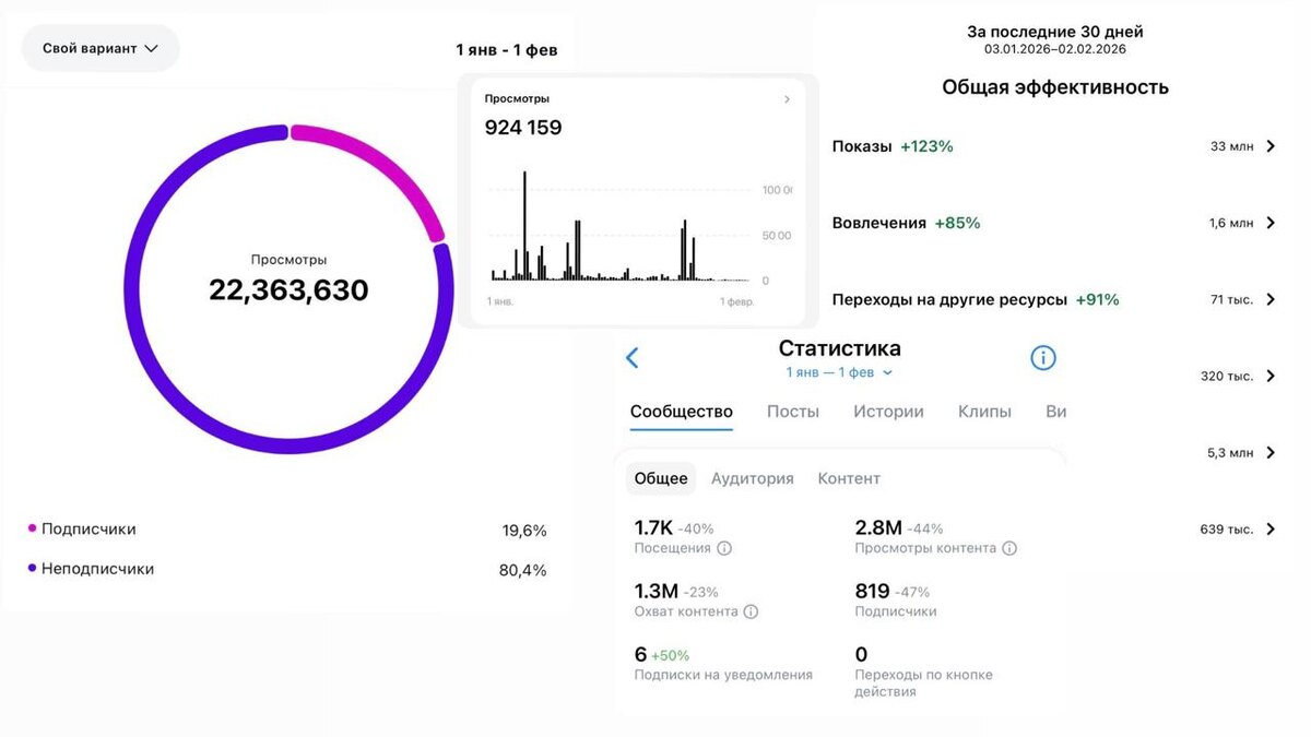 ! Сегодня активно подвожу итоги прошедшего месяца и могу с уверенностью сказать, что Январь дал очень хорошие результаты, как в просмотрах, та и заявках во всех соцсетях, которые я прямо сейчас развиваю. 95% упора сейчас делаю именно на вертикальный короткий контент, т.к. именно он сейчас пользуется большим спросом, привлекая мне ежедневно новых подписчиков А вот остальные 5% как раз упор на длинные ролики с экспертностью, которые уже прогревают ко мне, продуктам и продают. Тот кто говорит, что сейчас кризис - просто не умеет работать с трафиком и аудиторией. Сейчас это самый главный актив для любого бизнеса и продаж! Если в нем разобраться, то будут и продажи, и заявки, и много чего еще. Поэтому моя рекомендация - учитесь в 2026м продвигать соцсети, создавайте контент и все будет хорошо) Что сработало у меня, что в Январе собрали 60 млн просмотров? ✍️ ЦЕПЛЯЮЩИЙ КОНТЕНТ: Проработал индивидуальную подачу и контент, который цепляет аудиторию пользой и целевыми запросами. И этот к