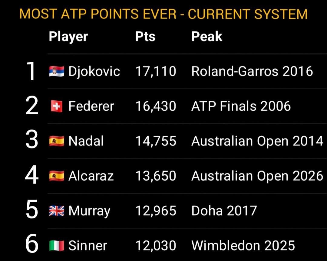 ): 1. Джокович - 17 110 очков (пик: Roland-Garros 2016) 2. Федерер - 16 430 очков (пик: ATP Finals 2006) 3. Надаль - 14 755 очков (пик: Australian Open 2014) 4. Алькарас - 13 650 очков (пик: Australian Open 2026) 5. Мюррей - 12 965 очков (пик: Doha 2017) 6. Синнер - 12 030 очков (пик: Wimbledon 2025) Подпишись на Эйс и точка
