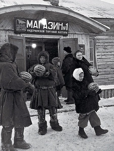 Торговля арбузами в поселке Амдерма на берегу Карского моря, 1952 год